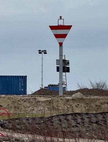 | 1975 | Rød og hvid båke af form som et timeglas. Leder overet i pejling 171,5º i den gravede rende. Brænder kun, når skib ventes. | |||