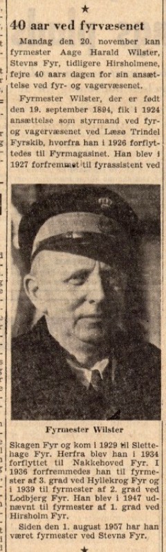 | Notits i Frederikshavns Avis den 9/11-1961 i anledning af 40 års ansættelse ved fyrvæsenet. Overtagelse af fyrmester stillingen ved Stevns fyr i 1957 har ikke kunne bekræftes af andre kilder. | |